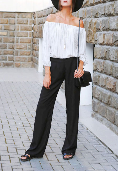 how to wear off the shoulder top - black pants