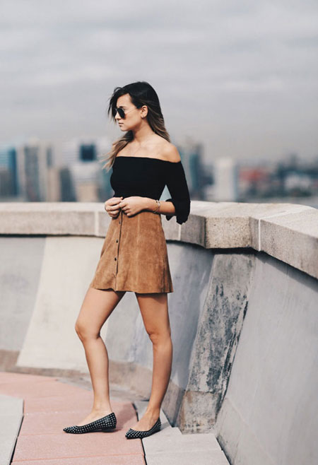 how to wear off the shoulder top - suede mini skirt