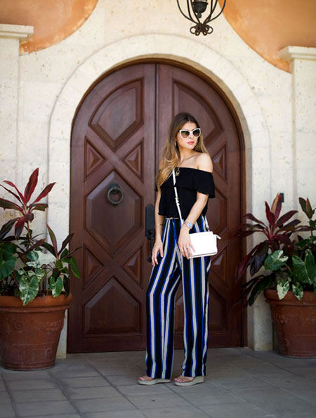 how to wear off the shoulder top - patterned pants