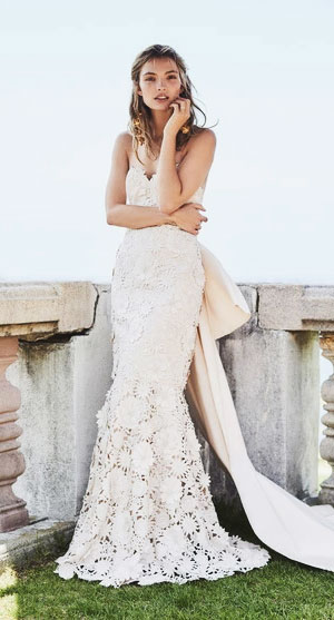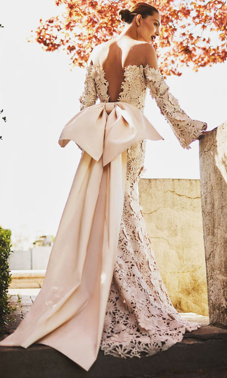 Imagine a wedding dress that has every detail the current fashion world is crazy about – Off-the-shoulder’s, statement sleeves, bare backs.