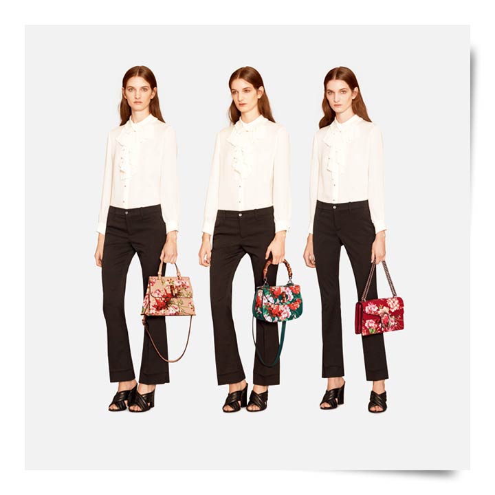 These beautiful Gucci handbags are a must-have from 2016 resort collections! Especially their Bamboo Blooms line. We’re very excited to see these! Gucci’s top-handled bags come in three different colors – nude, forest green, and maroon red. The Cerise Blooms print on leather elevates the entire look and the bamboo accents (top-handle and/or closure) add a great touch of elegance.