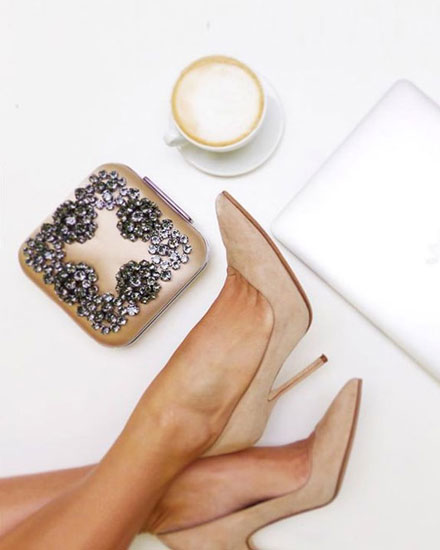 All of Manolo Blahnik bags (evening clutches) are adorned with different shapes and sizes of Swarovski crystals and some of them are still represent the Blahnik’s signature Hangisi style.