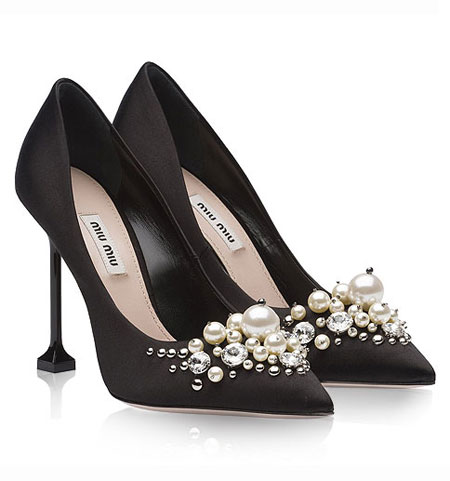 Miu Miu Embellished Satin Pumps in Pink | Lovika