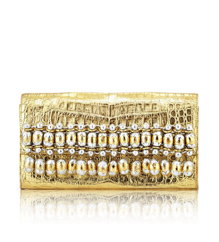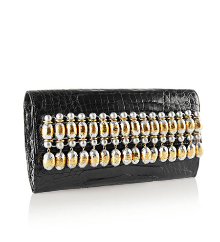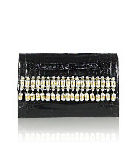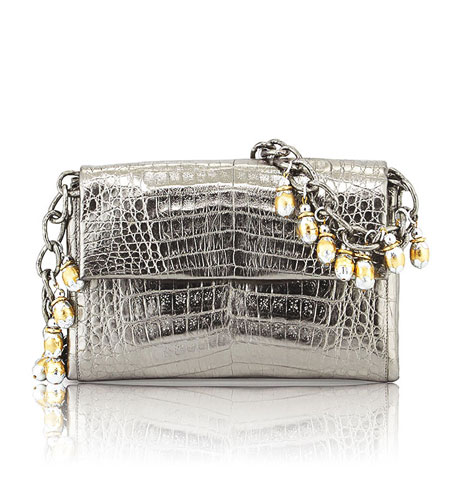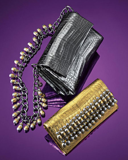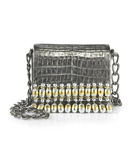 Now this is a refreshing take on fringe! Nancy Gonzalez, known for her distinctive bags covered in exotic skins (mostly crocodile) and vibrant colors, showcases her latest collection of handbags that are accented with metallic-beaded fringe.