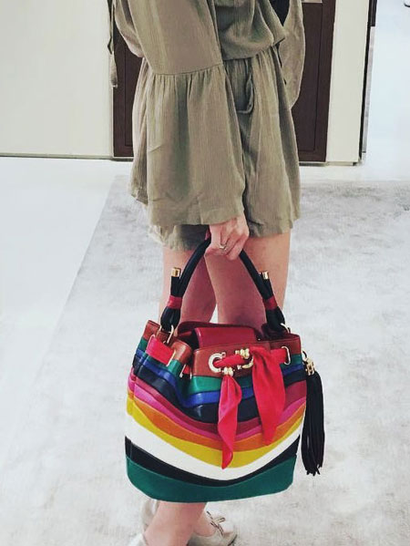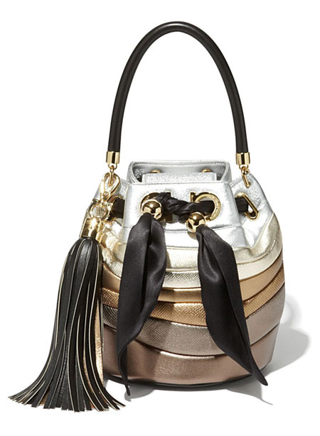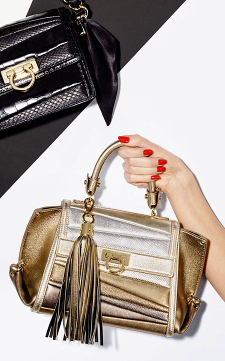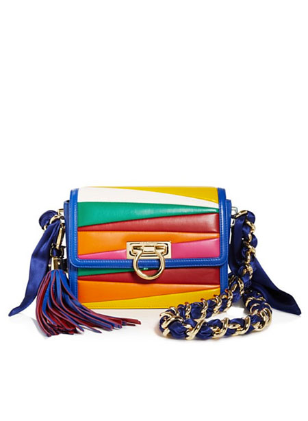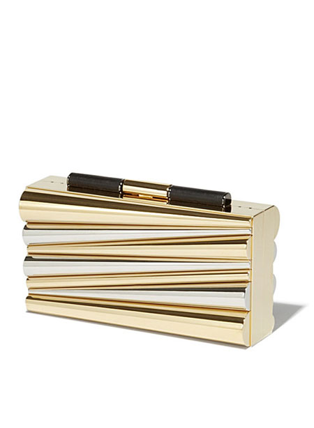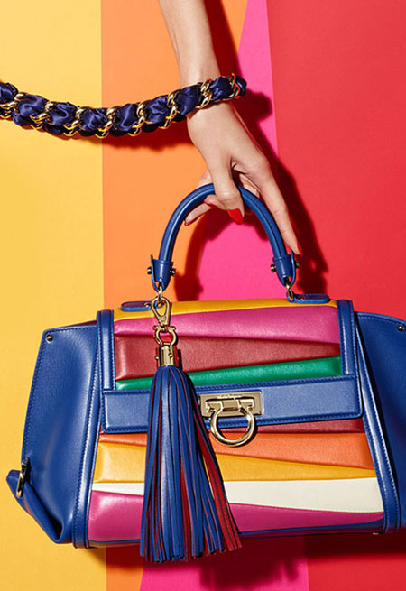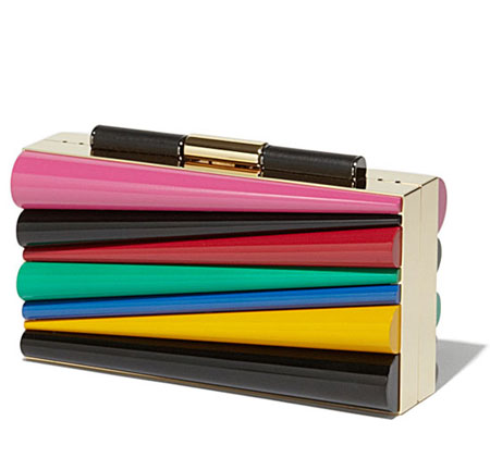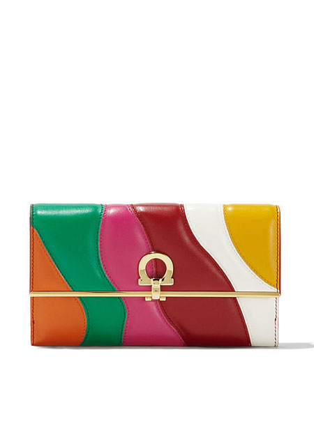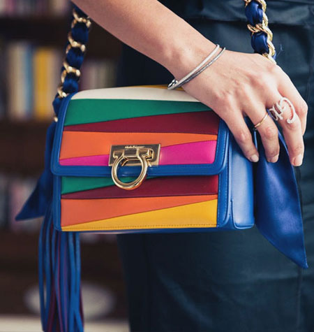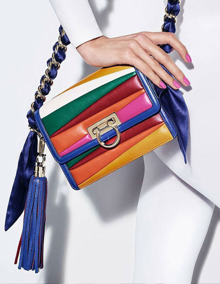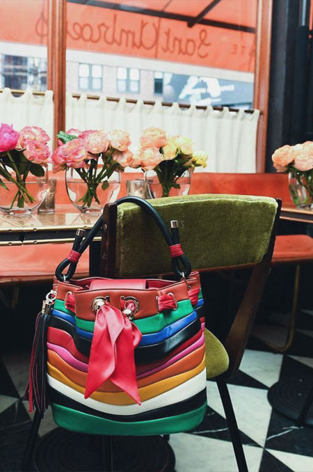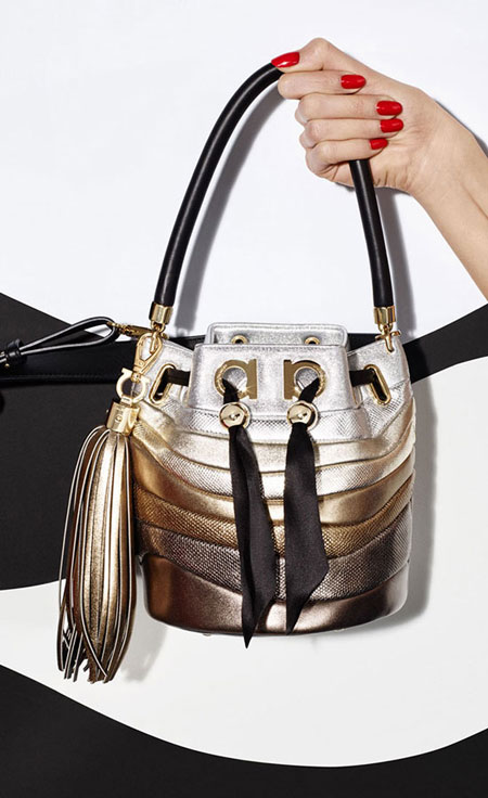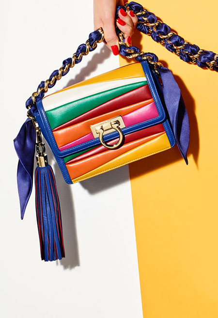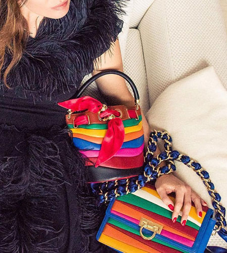 Sara Battaglia, the Italian handbag designer, brings her signature bold and colorful styles to her latest collaboration with Ferragamo Salvatore. If you’re into statement accessories that are really out there without looking overwhelming, you will love this Salvatore x Sara Battaglia bag collection. The designer uses lovely rainbow-hues in asymmetrical shapes. Our favorite is the Sinilia minaudiere clutch bag made of lacquered leather in 3D stripes. If you have a lot of black and white in your closet, this will add the perfect touch.