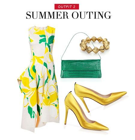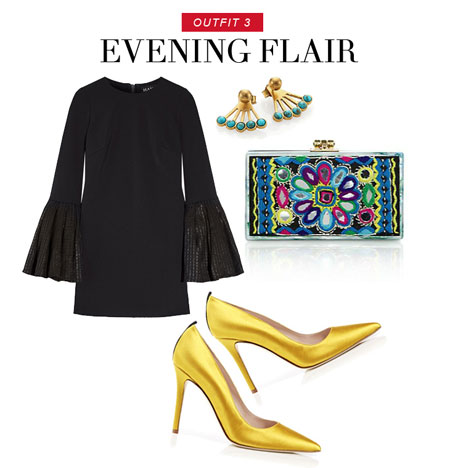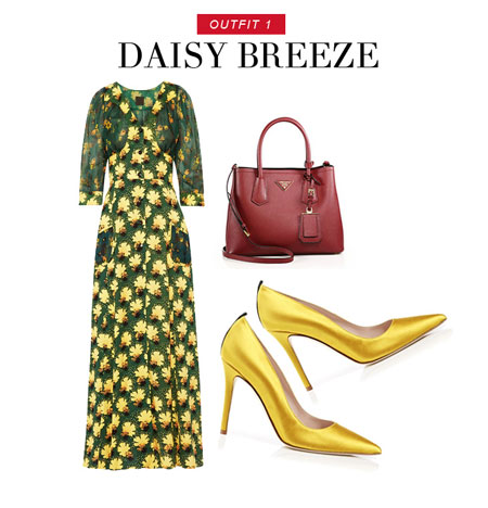 Our favorite from her collection is the yellow Fawn satin high heel (followed by the hot pink pair she has on in the featured photo above). To give you some inspiration, we put together 3 amazing outfits inspired by these wonderful yellow pumps.