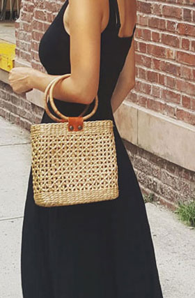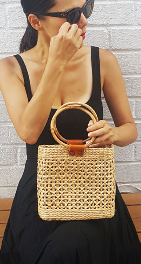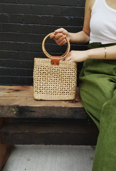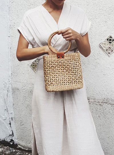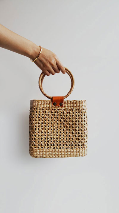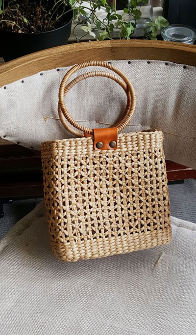 This chic tote is 100% naturally handmade by Vietnamese artisans. There is no machinery involved here! Every little detail from the water-hyacinth weave pattern to the rattan-wrapped round top handles is ALL hand-made.