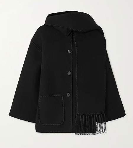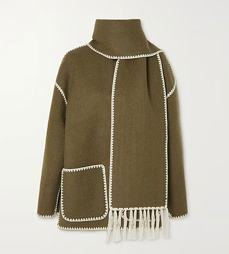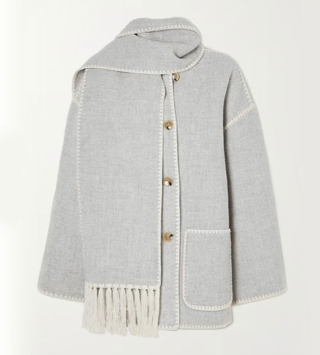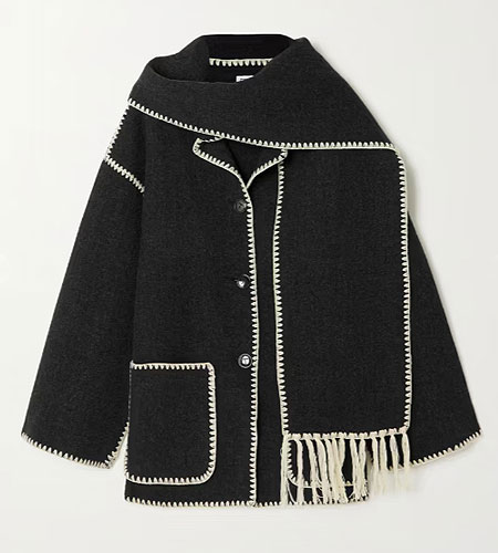 ‘Once you see it, it’s stuck in your head’, is what comes to mind about Toteme’s scarf jacket. This beautifully made coat has an instantly recognizable look with its contrast chain stitch outlines and an attached scarf.