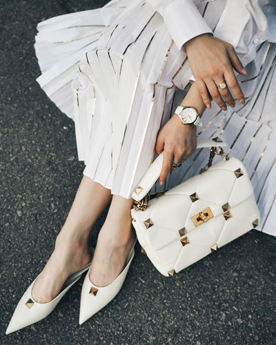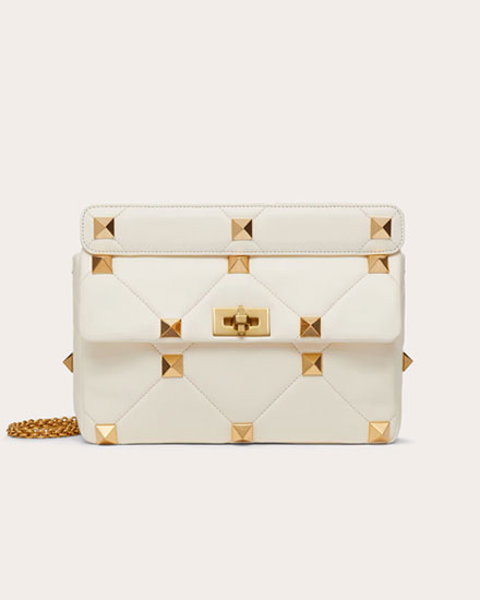 Love at first sight: Meet Valentino’s new Rockstud handbags (aka Roman stud Bags). The new studs are simply bigger and better and we are in love! These Roman stud chain bags are crafted from smooth lambskin nappa leather and the big gold Rockstuds beautifully accentuate the classic quilting detail – Definitely a must-buy for your Spring-Summer 2021 collections.